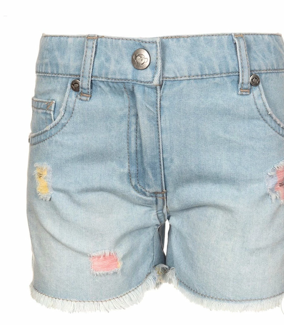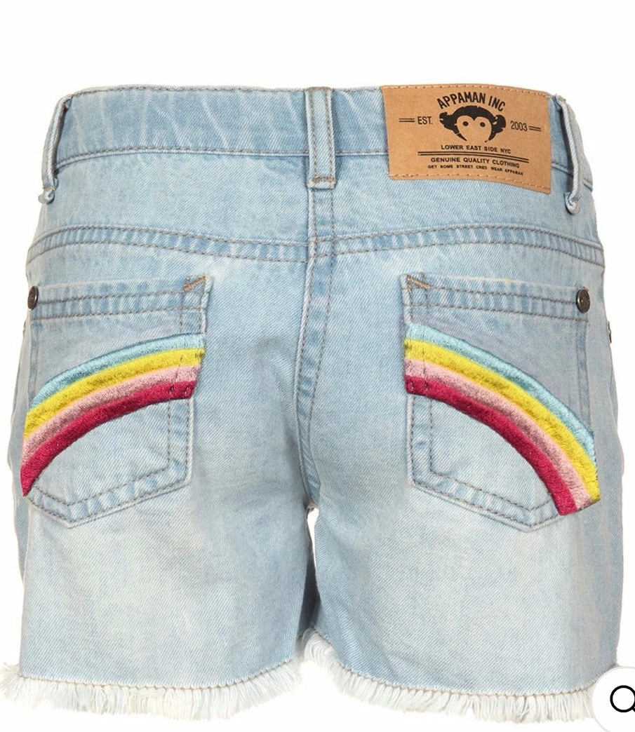 Relaxed fit shorts, with a longer inseam, mean comfortable, classic summer style. This distressed denim is made with rainbow colored cross thread, so color peeks out of the reinforced rips and tears.