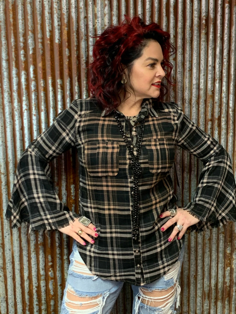 Isabella bell plaid shirt, bell sleeves with frayed edges. Β The back is absolutely beautiful embroidery of two peacocks.