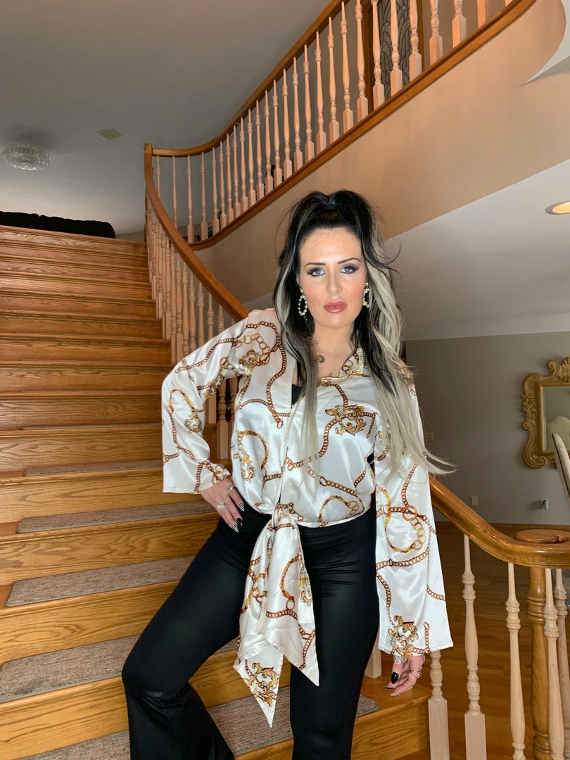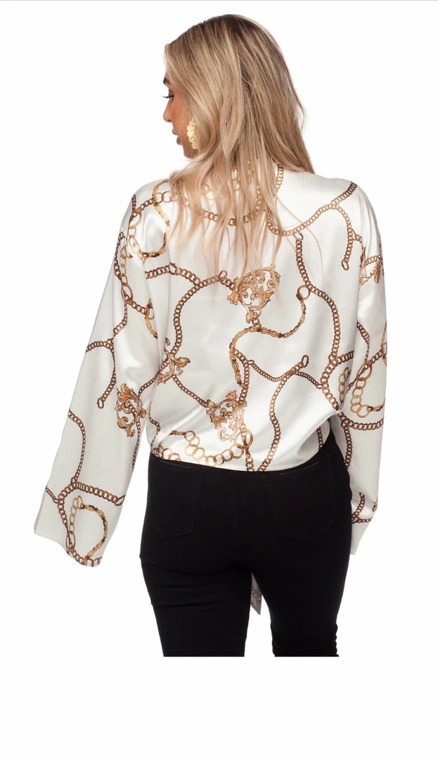 Youโll be weekend ready with our Gayle Top! ย She features a v-neck, long bell sleeves, tie front and a hook and eye closure in front! ย