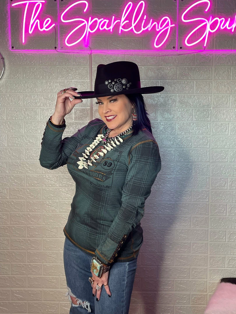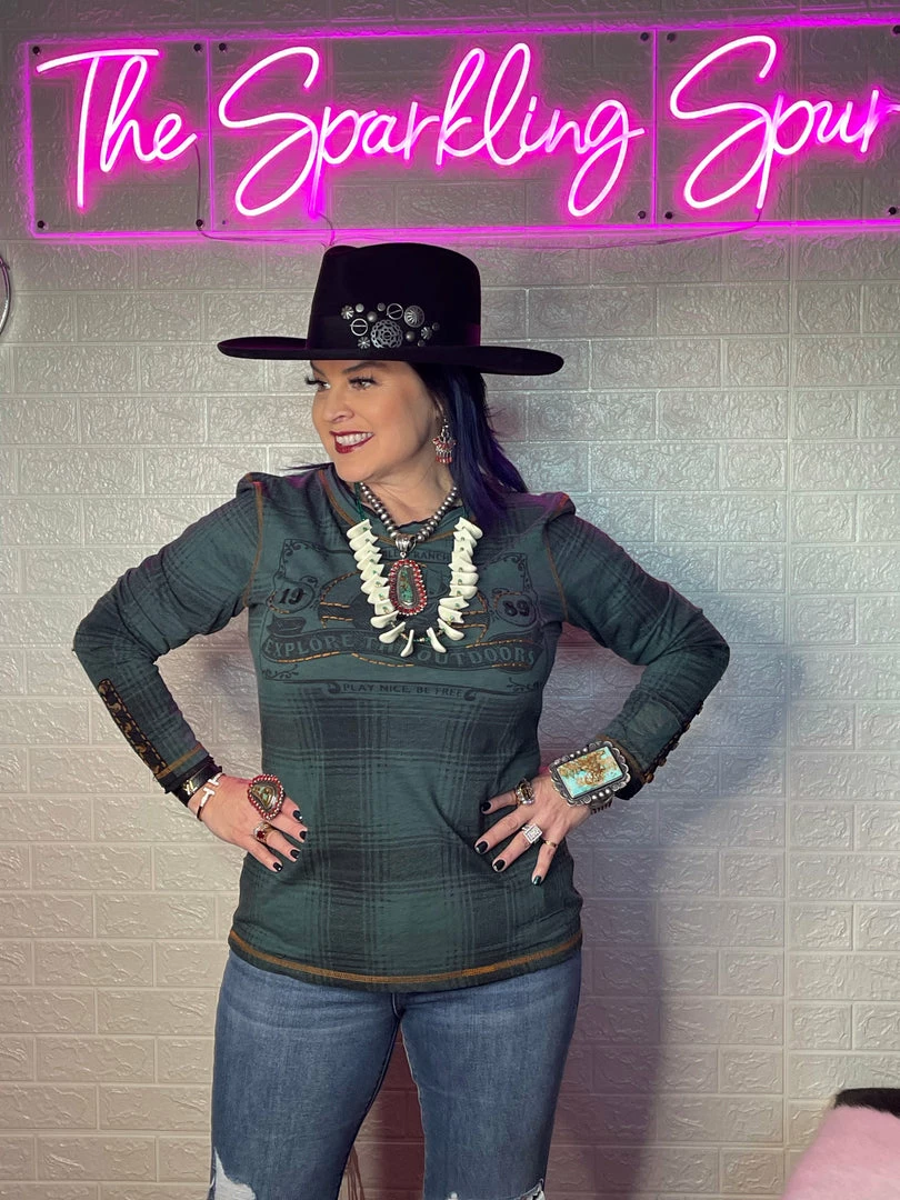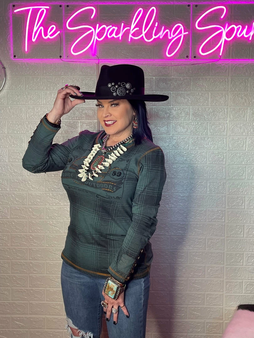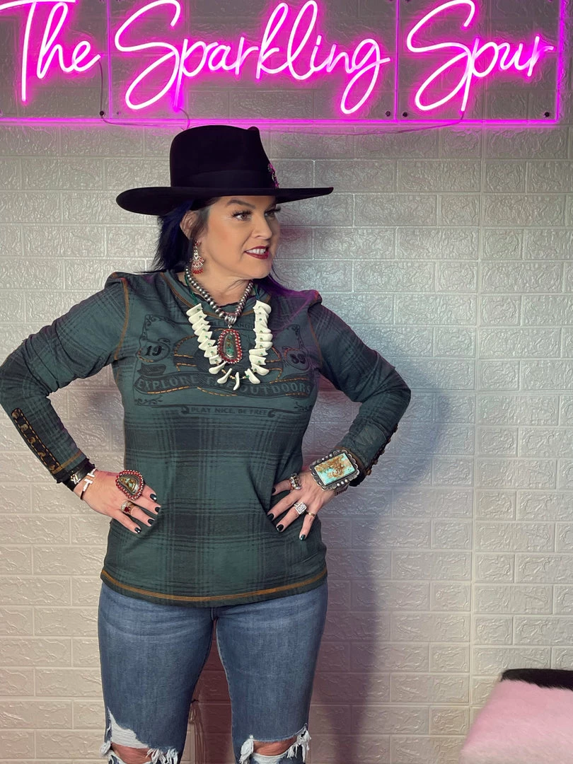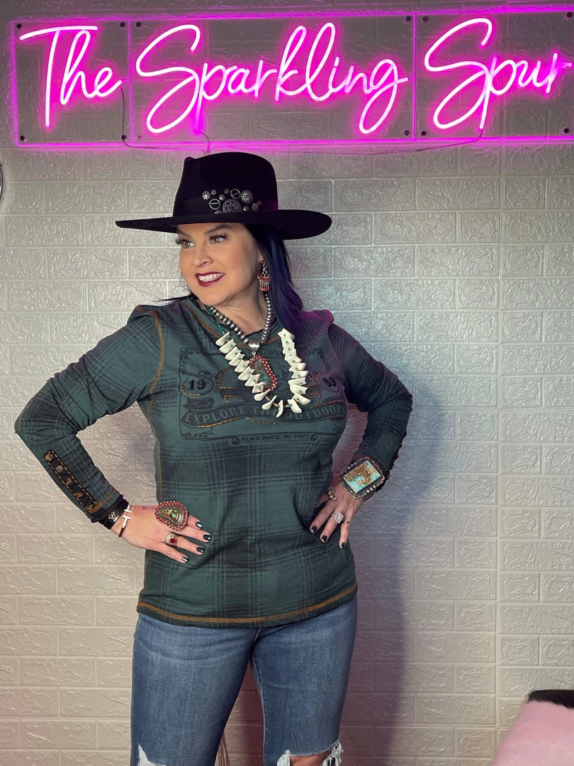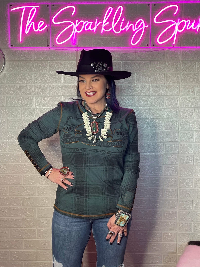 Once again, plaid pleasantly surprises! This long-sleeved cotton tee takes the classic print and adds a little something with a tonal outdoorsy image that’s accented with subtle hints of embroidery that complement the contrast stitching. Easy everyday top!