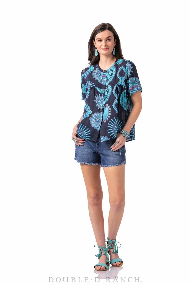 We mean it when we say we absolutely cannot get enough of Southwestern jewelry, and we worked it into a whole new way to wear. The Jewelry Junket Blouse is a short-sleeved button-down with a flowy fit and chic subtle gathering. The custom DDR print features scaled up clusters in traditional turquoise with pops of purple spiny oyster. Wear it buttoned as a blouse or open over a solid cami for an effortless everyday look thatβs brimming with southwestern style.