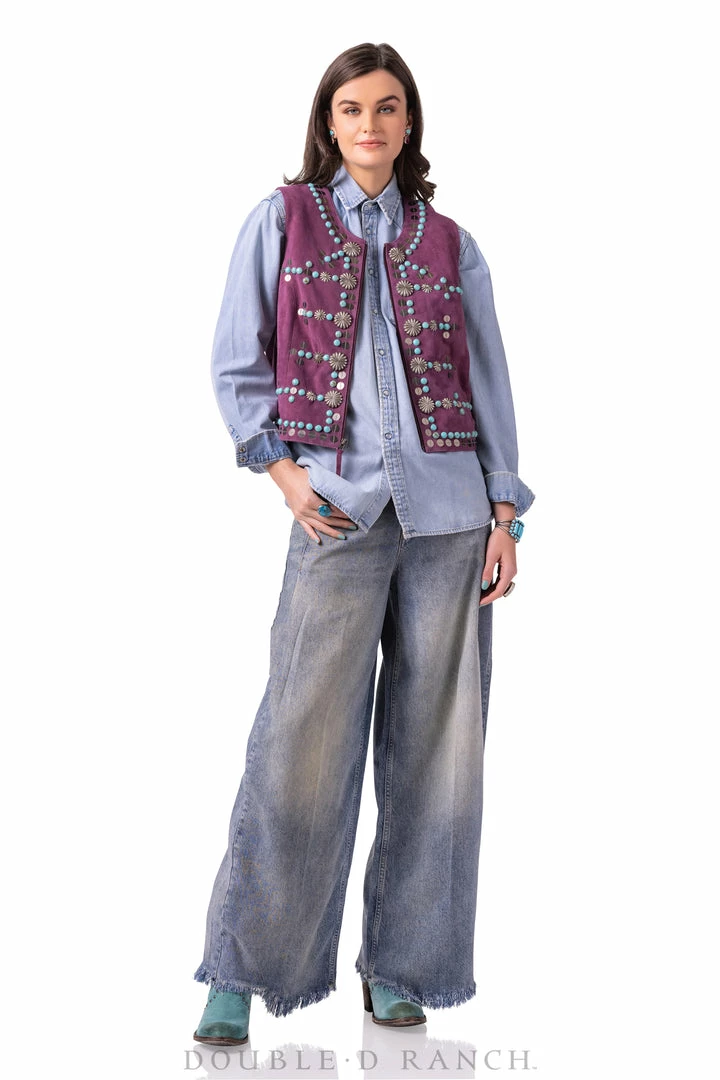 Β This gorgeous goat suede vest brings together lots of things we love: rich color, custom conchos, (faux) turquoise, and over-the-top embellishing! Itβs a classic zip-front silhouette and it comes in two lovely hues (good luck choosing!) so you can amp up almost any outfit with ease.