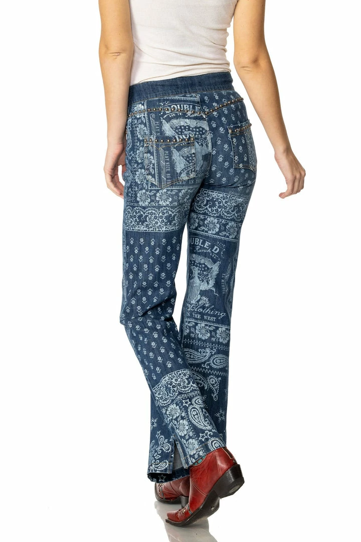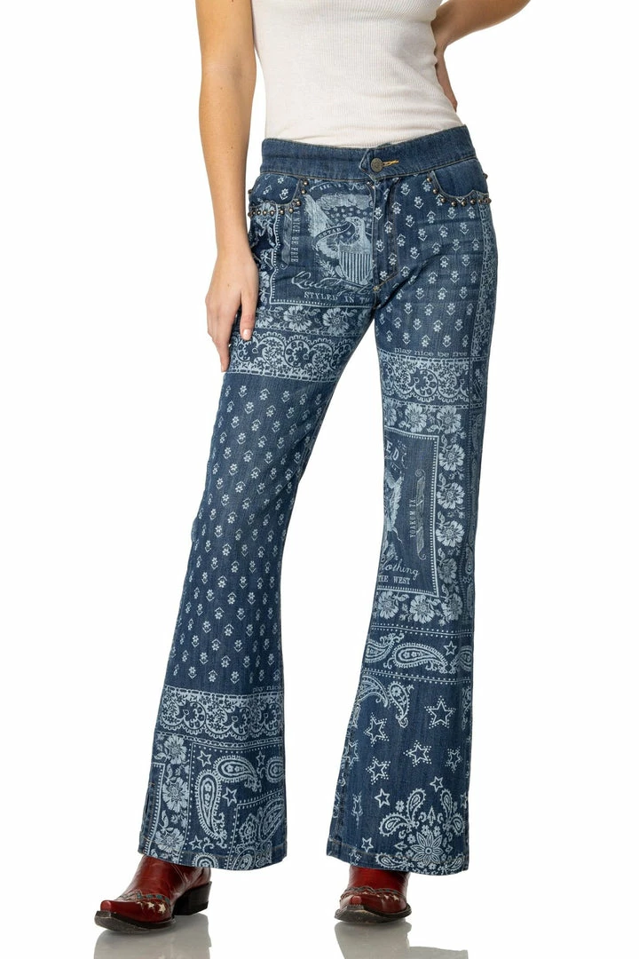 Sissy channels the late β70s-early β80s eraβ¦ cβmon, how could we NOT do a bellbottom jean? And you know weβre bananas about bandanas, we couldnβt resist combining the two. This blue-and-white bandana print brings a sense of southern retro style and goes perfectly with so much of the Sissy collection for a lowkey country vibe. Pair them with the Sissyβs Tank or the Urban Cowboy Bling Top really round out your look!
