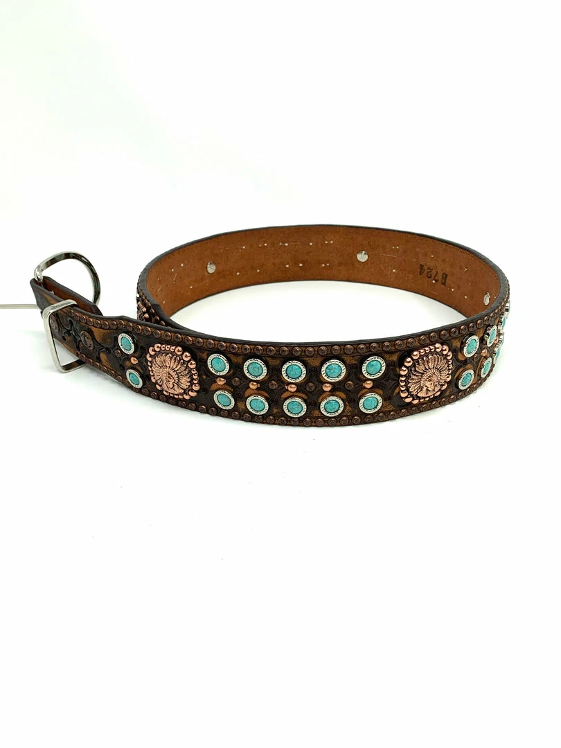 Vintage tooled belt with antique engraved copper dots along both edges, 2 rows of turquois matrix stones and copper indianhead conchos.ย ย