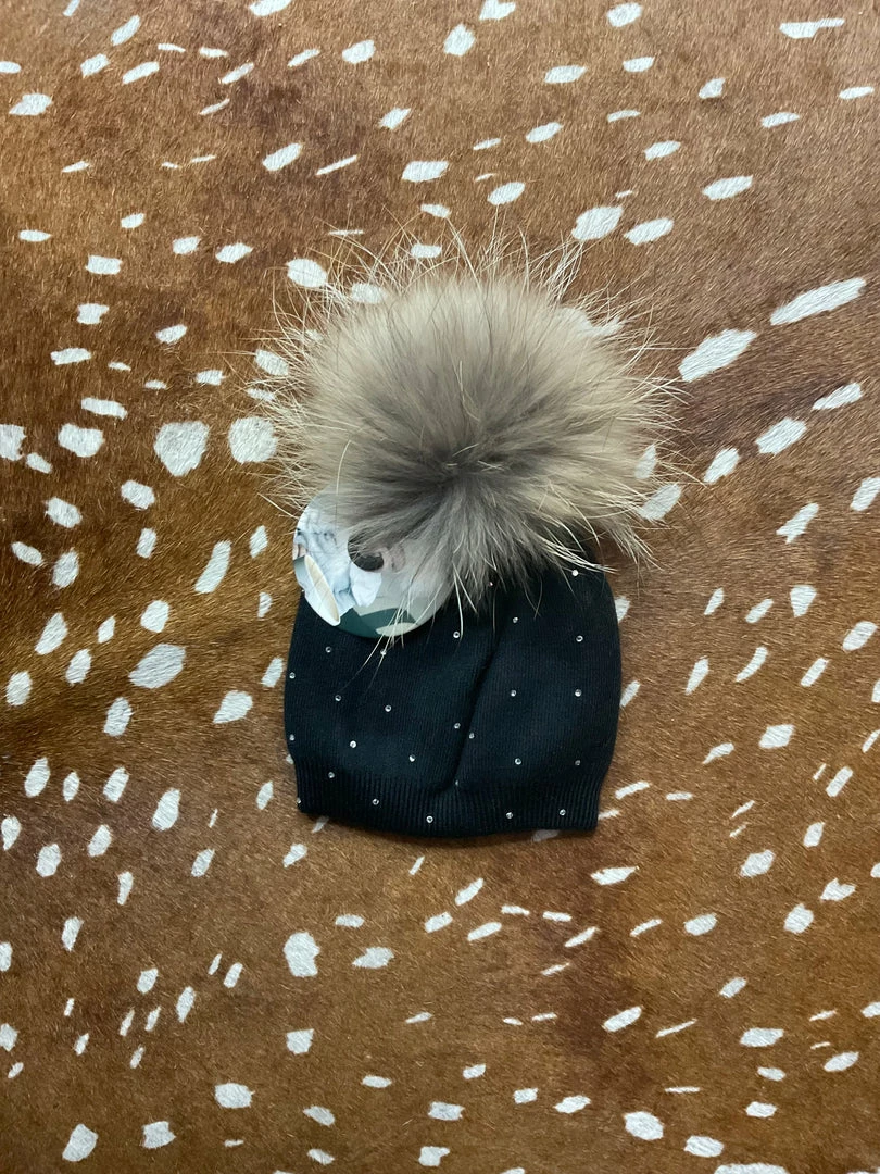 Cotton Sparkle Baby Beanie with snap on genuine raccoon fur pom.