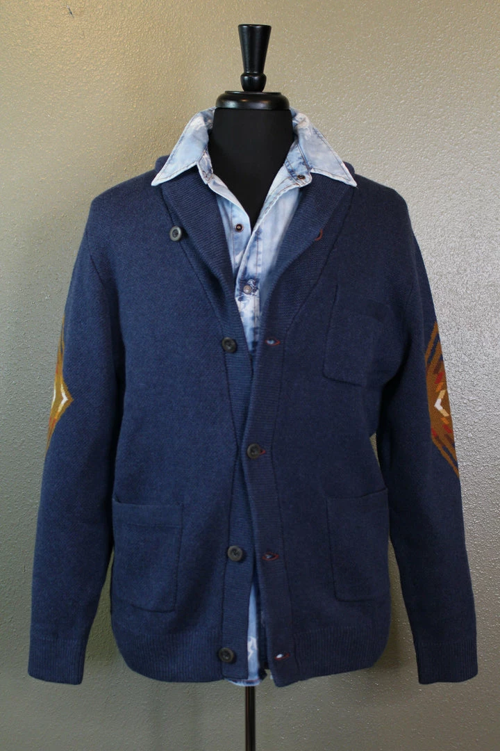 Men’s cardigan crafted of pure cotton in a mid-weight knit, for breathable comfort any time of year. Solid front with patterned sleeves; back features our historic 1923 Harding pattern. Three pockets; ribbed shawl collar, cuffs and hem.