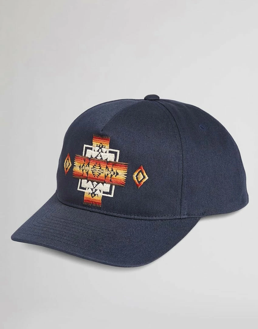 A classic five-panel cotton ball cap with a curved brim, snap-back closure and embroidered motif on front.