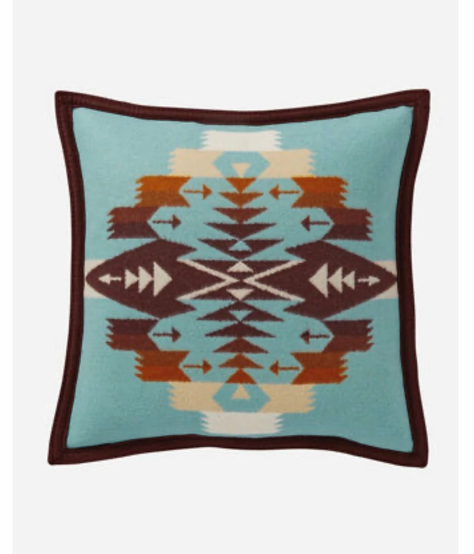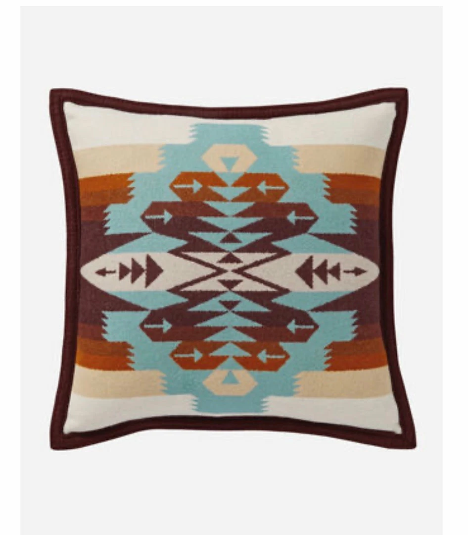 A woven-in-USA wool pillow in a vibrant pattern based on an ancient legend. Β Feather fill insert. Β
