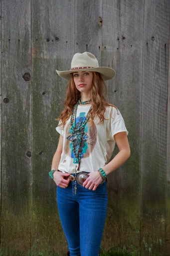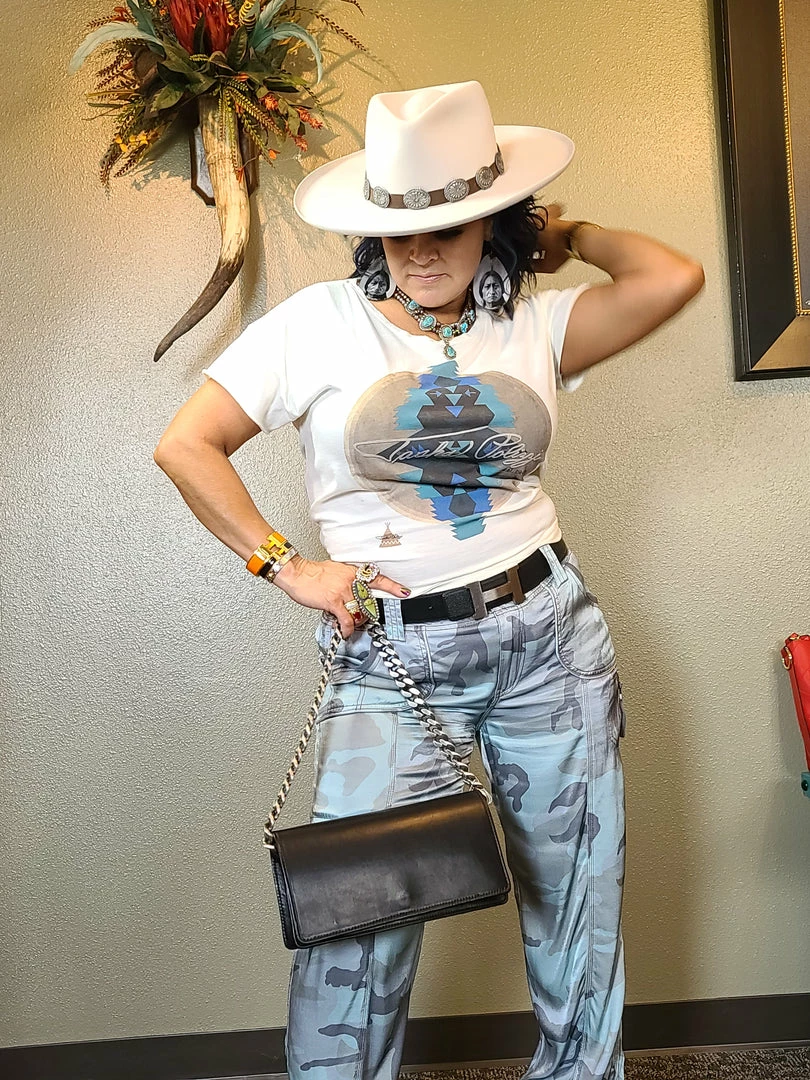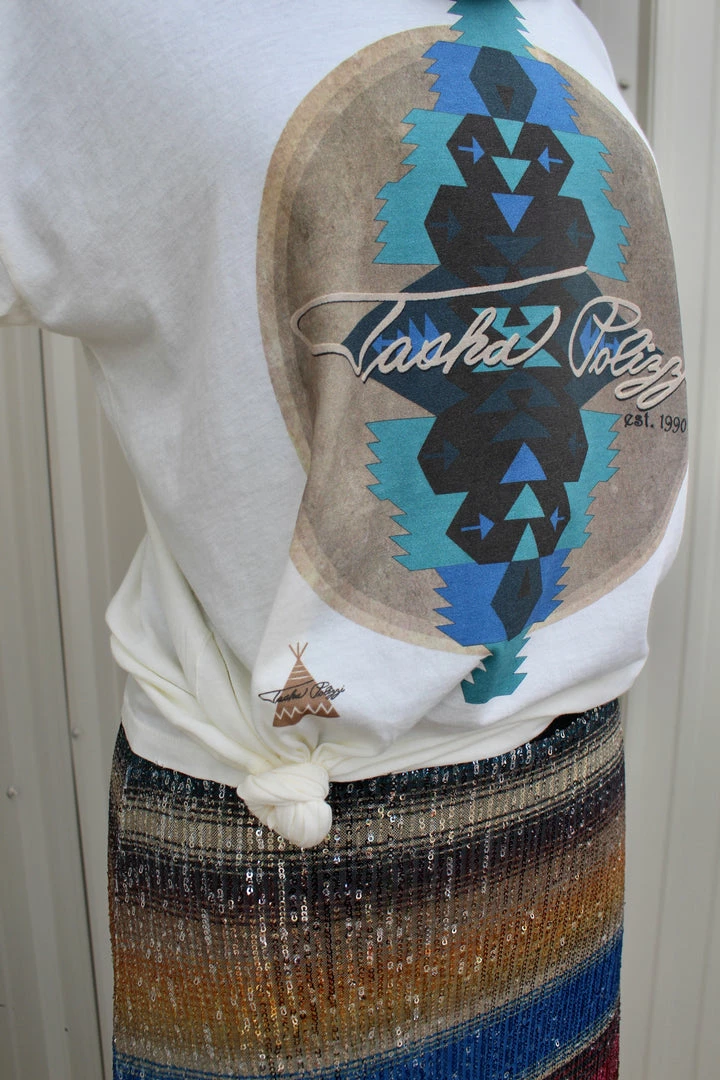 Tasha Polizzi’s graphic tee.ย Love the soft colors of this tee.ย Pairs beautifully with the Lydia Skirt.