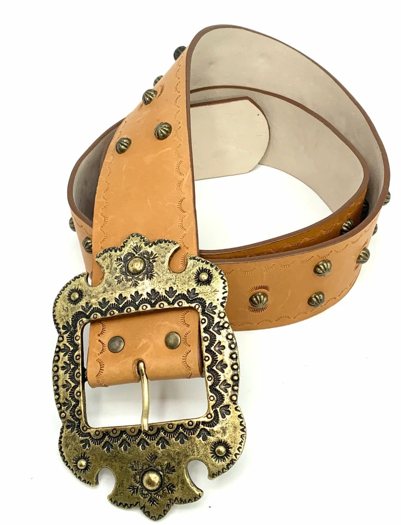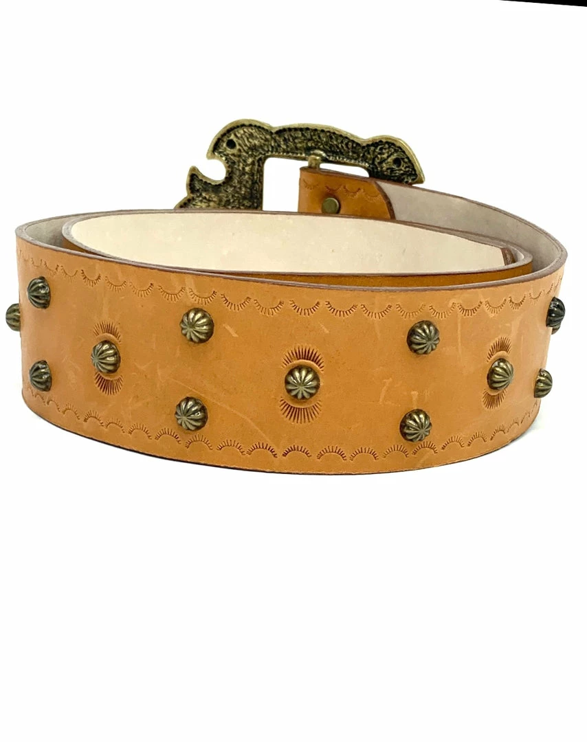 Simple and functional.ย This belt is adorned with metal accents and a stamped design along both edges.ย ย