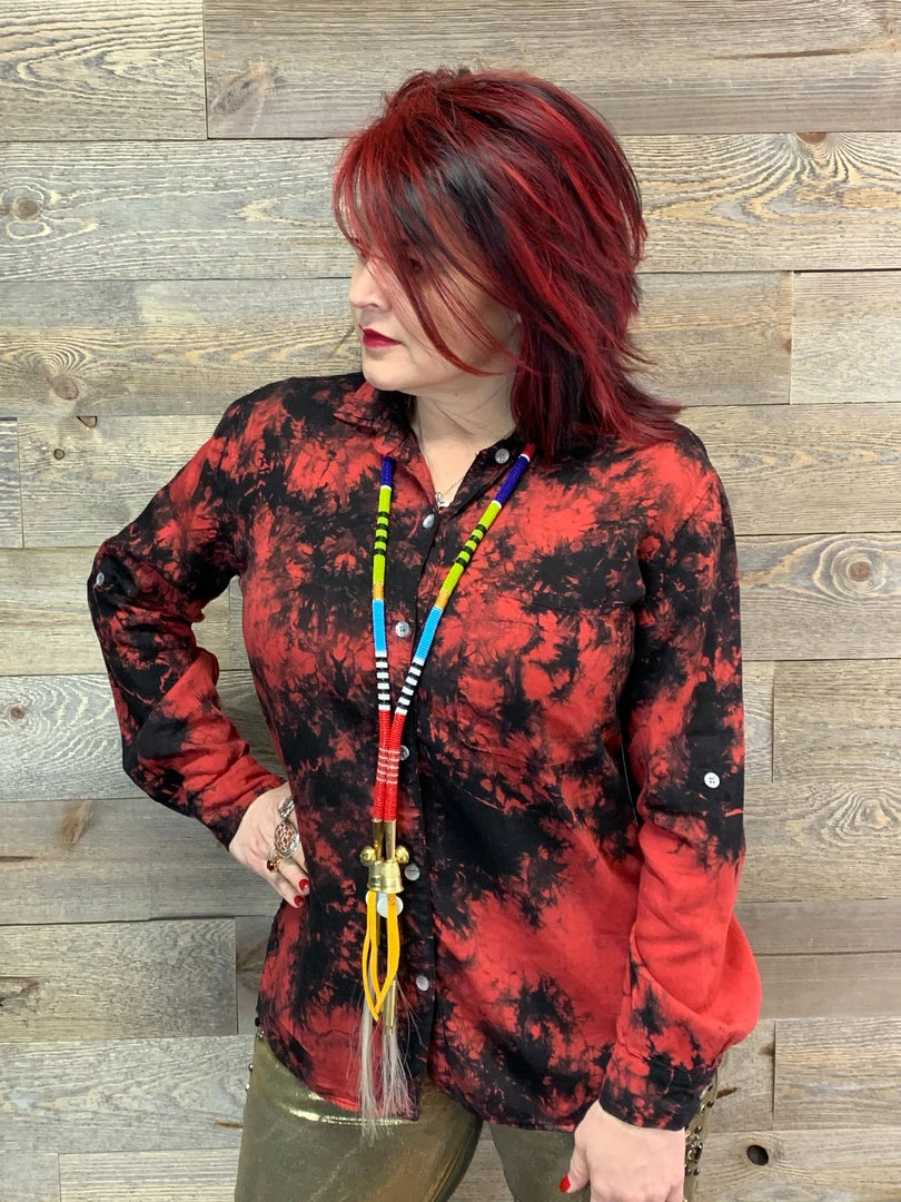 The Valentine is so pretty!! ย It is a button down red & black shirt made of 100% Rayon. It has a stripe down the sides and a fabric rose design on the b๏ฟผ๏ฟผack. Roll up and button sleeves optional.ย