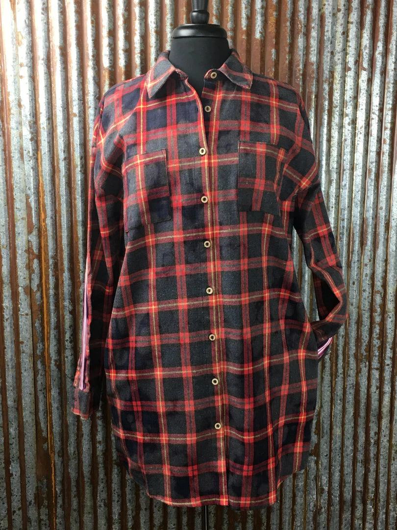 Long sleeve plaid tunic with a “wonderful” sequinned aplique on the back.ย Two breast pockets and two side pockets.ย How could you not feel wonderful in this?