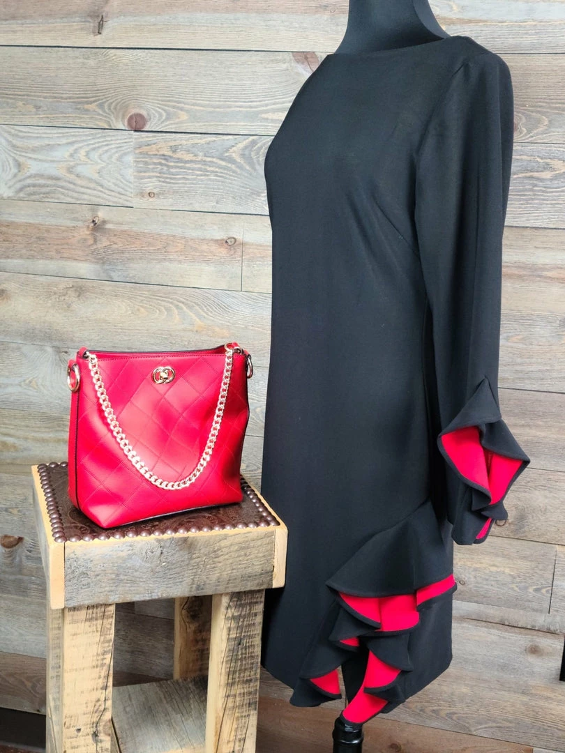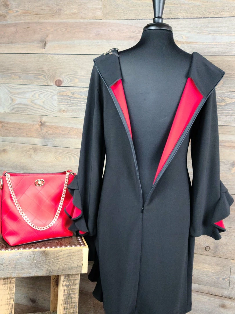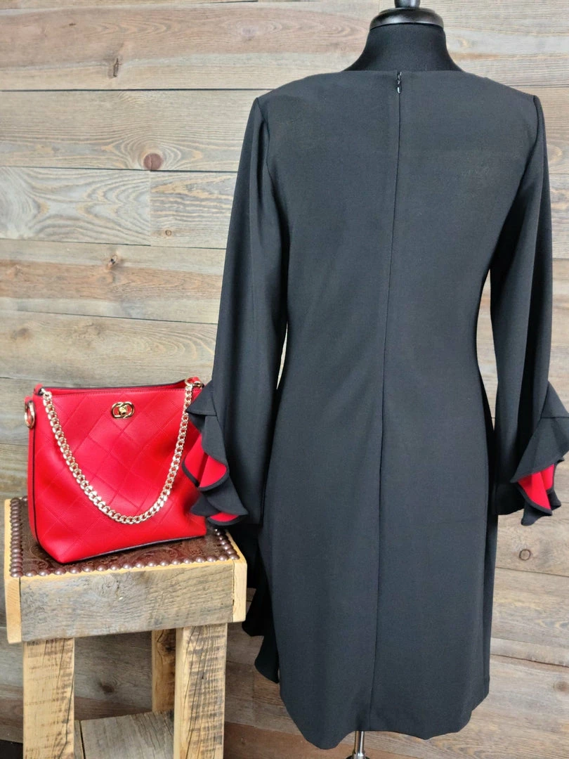 Simple with a flair! Black dress with red lining that is also exposed in the ruffles on the dress and sleeves.