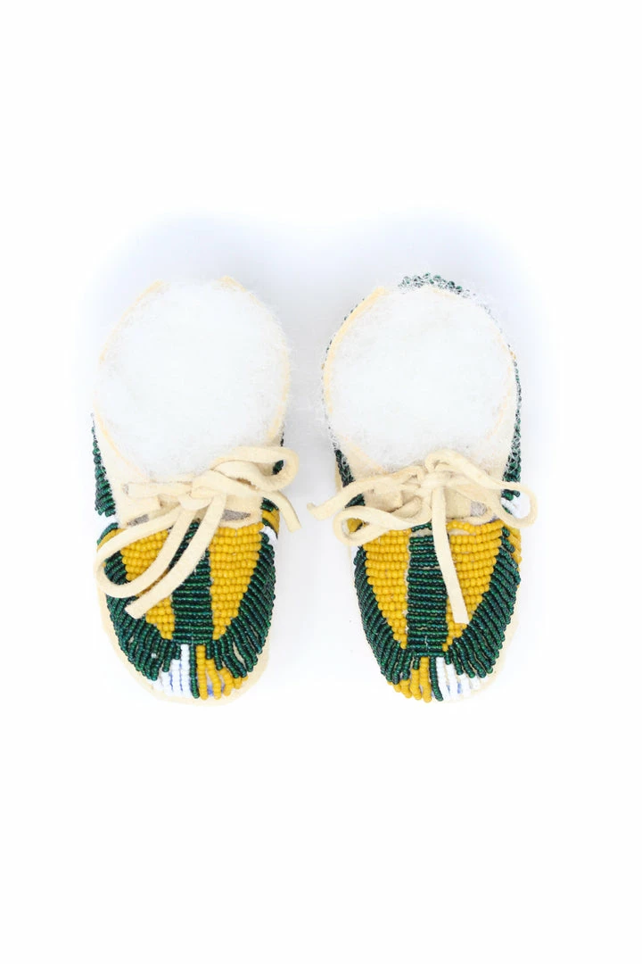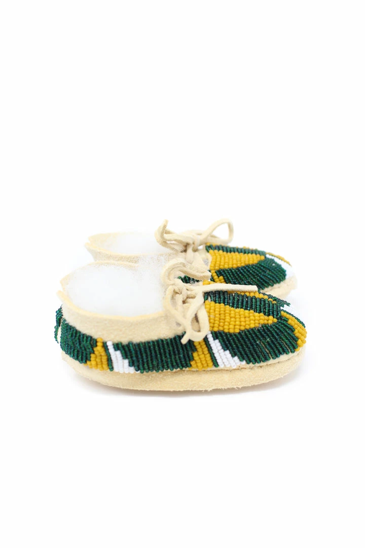 Tanned hide baby moccasins adorned with size 11/0 vintage seed beads.