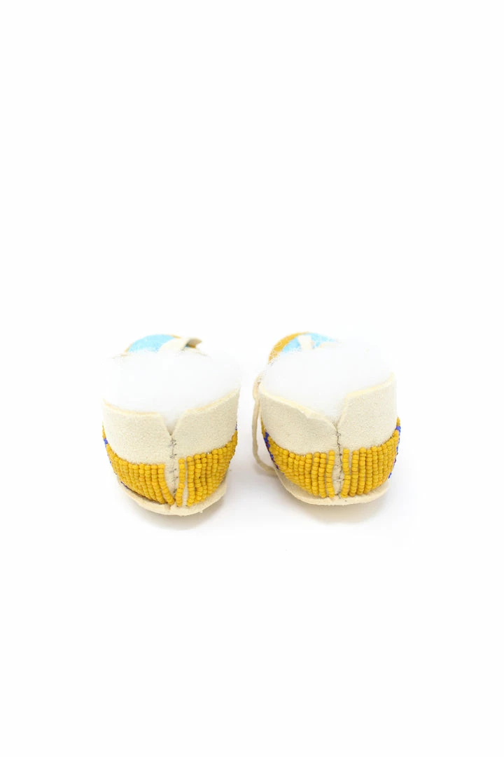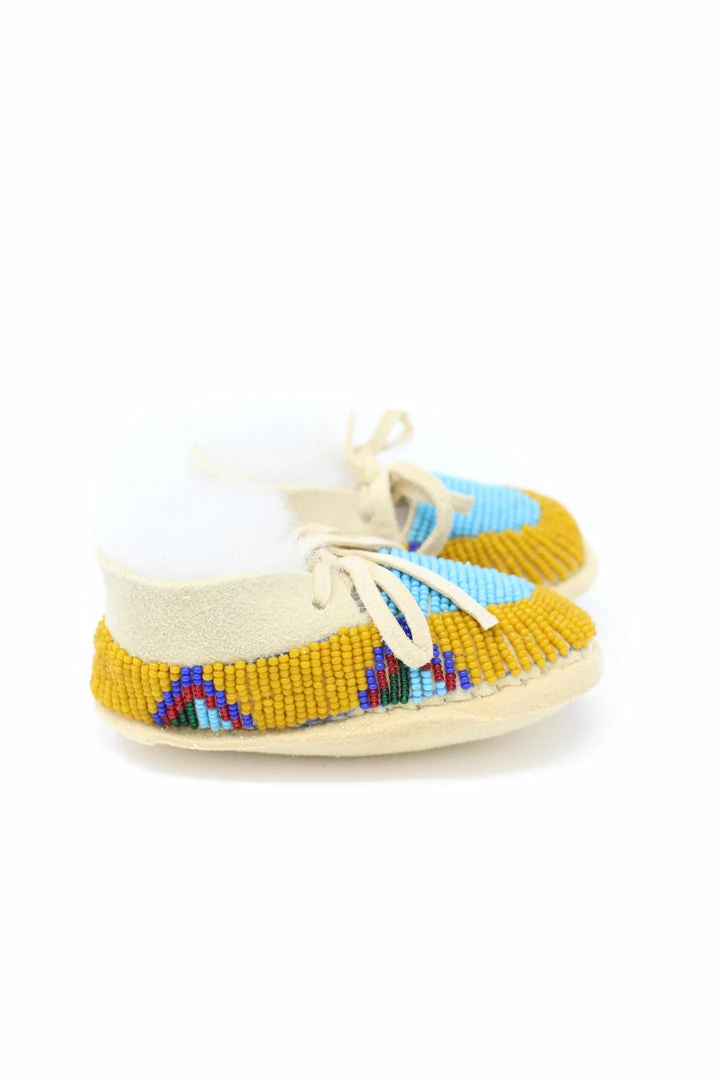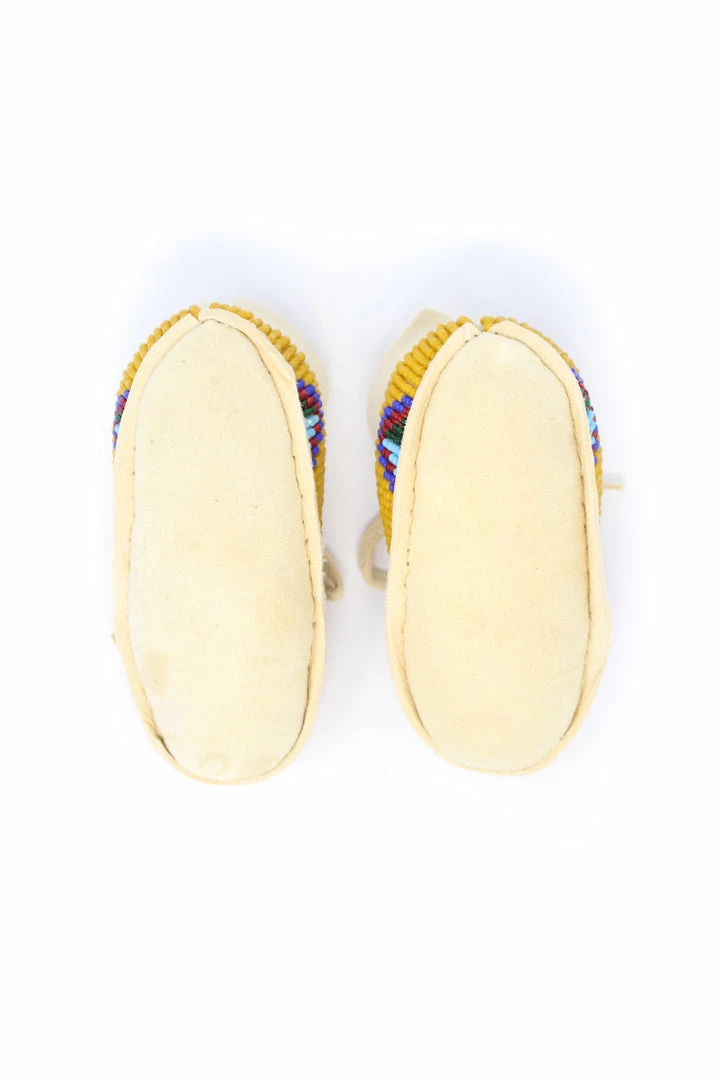 Tanned hide baby moccasins adorned with size 11/0ย vintage seedย beads.ย