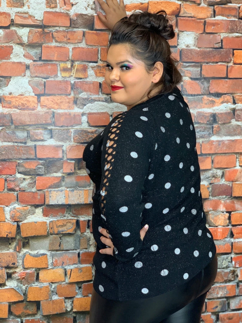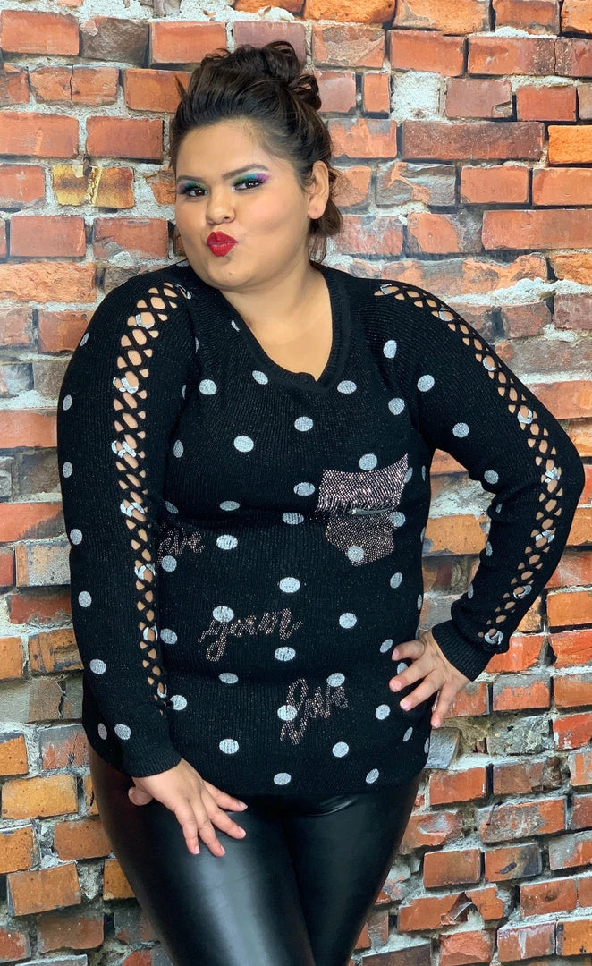 What a fun sweater! ย Love all the sparkles, polka dots, sparkly stones, metallic silver and the peekaboo cutouts all down the sleeve๐ฅฐ๐ฅฐ๐ฅฐ