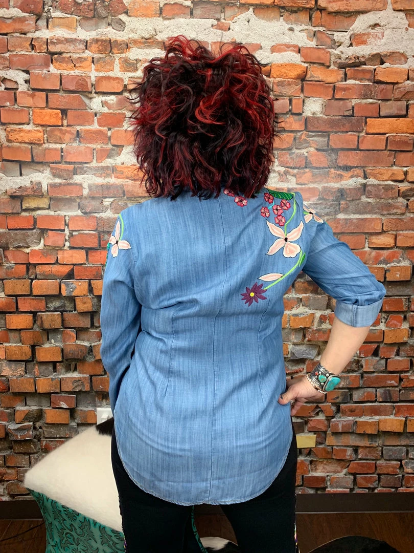 This lovely top features intricate embroidery on soft denim. Fits true to size.ย