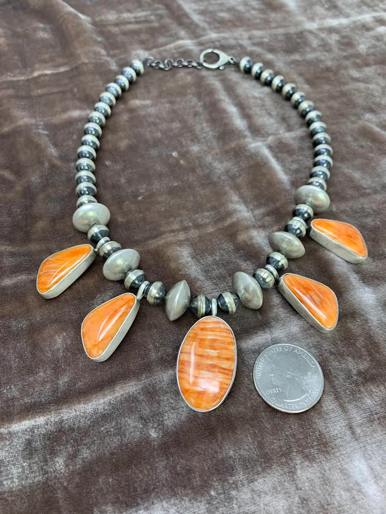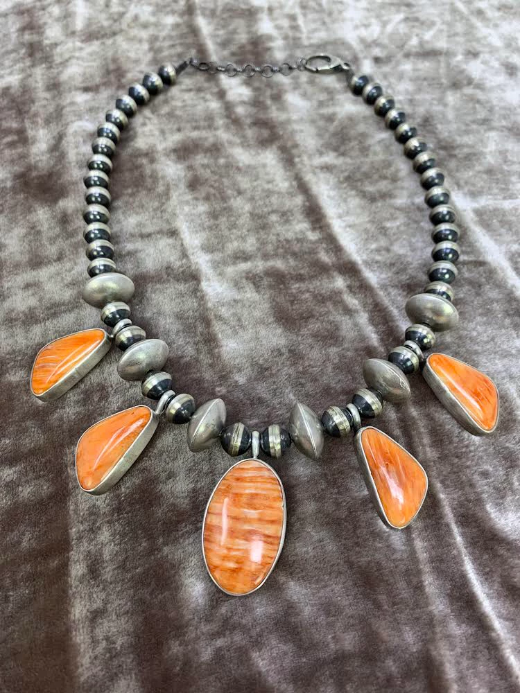 This necklace is even more stunning in person. Featuring 5 spiny oyster cabs strung along with Navajo pearls.Β