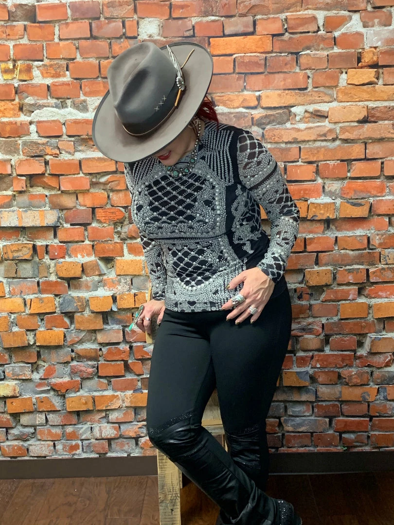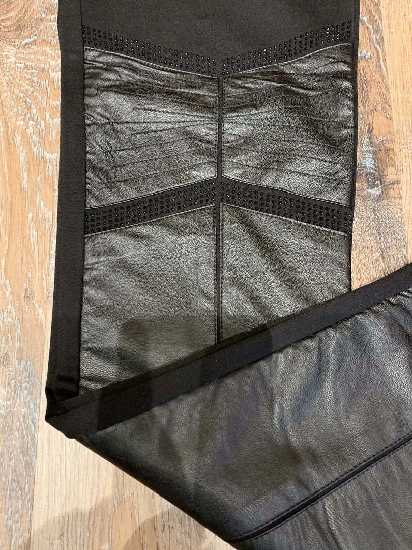 The Perfect legging that just feels and looks good! ย Faux leather from knee to ankle and a touch of black crystals.